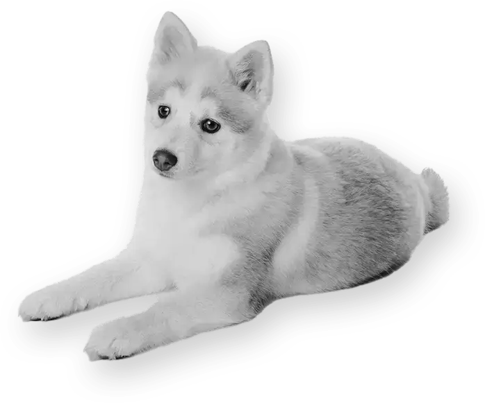 A white and light gray dog with pointed ears is lying down on its stomach against a black background, looking slightly to the side.