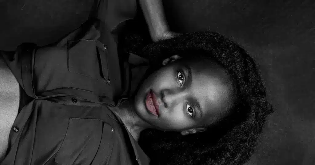 A woman with natural curly hair lies on her back, gazing at the camera. She wears a dark button-up shirt. The black and white photograph emphasizes her striking features and serene expression.